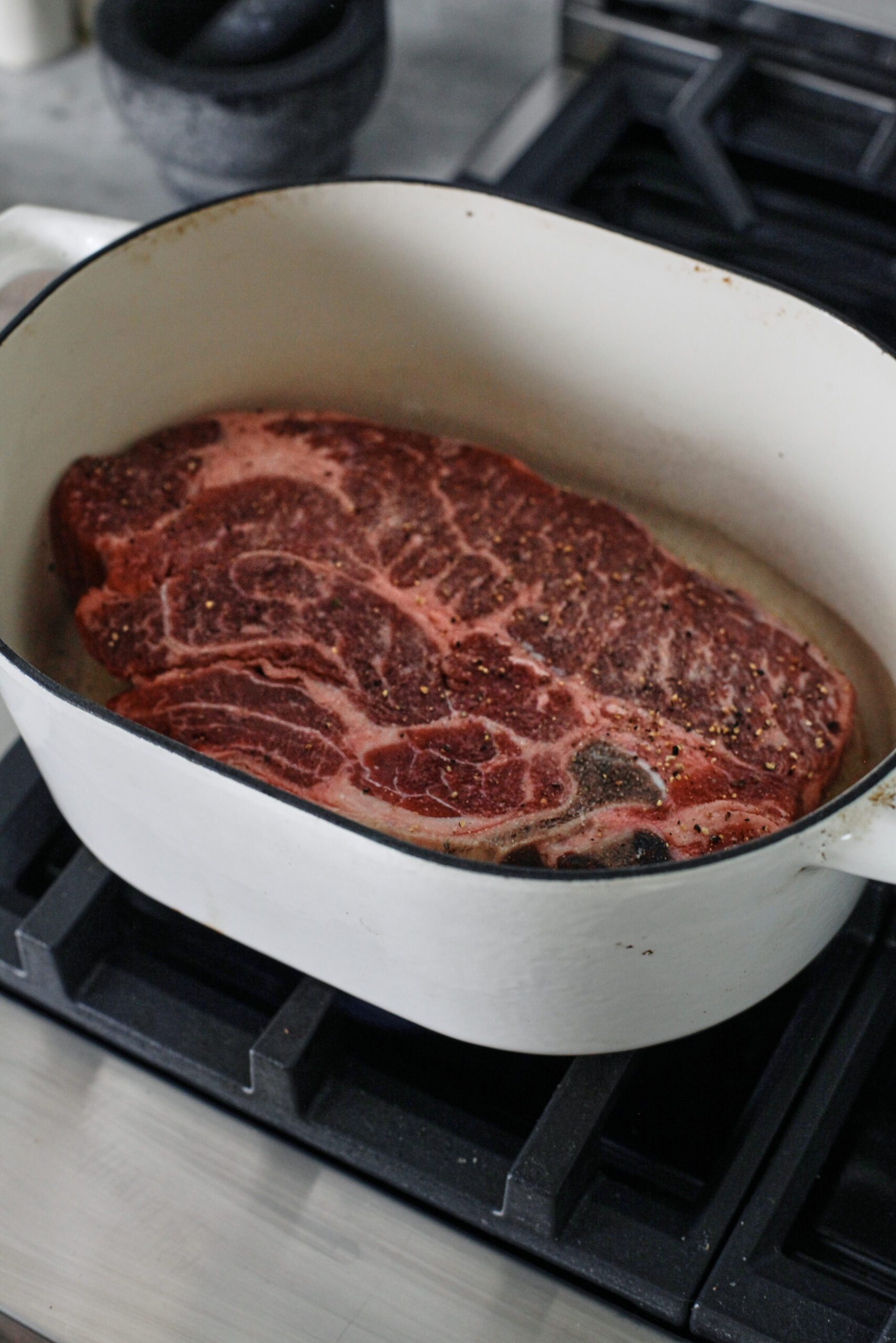 • Braise in the oven for 2.5 to 3 hours, until beef is very tender. Option to add in baby potatoes and carrots into the dutch oven (if you have room) for the last hour. If not, you can boil, steam or roast those separately and serve together.