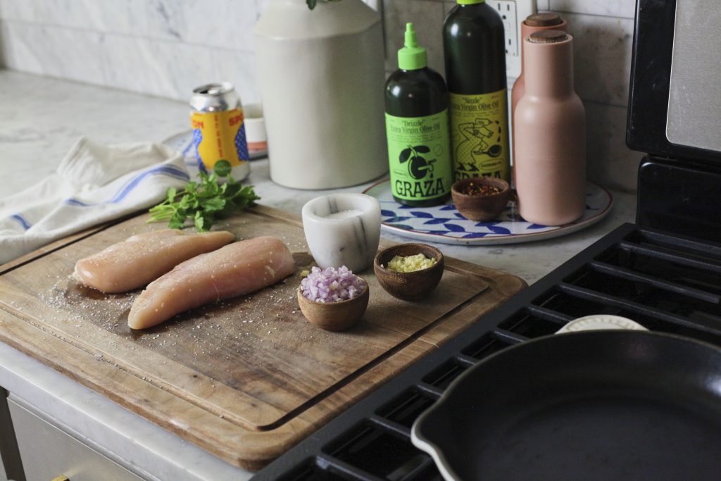 Prep is a breeze for the Champagne Chicken dish. Take your chicken breasts out 20 minutes prior to cooking so that we can get a more even cook. When you cook cold chicken straight from the fridge, the outer layers may cook faster while the center remains undercooked. Bringing it closer to room temperature is definitely going to help the chicken cook evenly throughout!