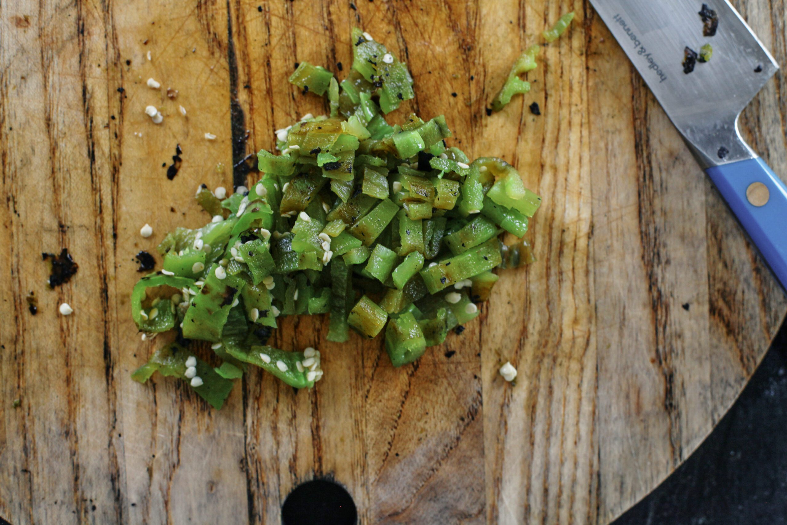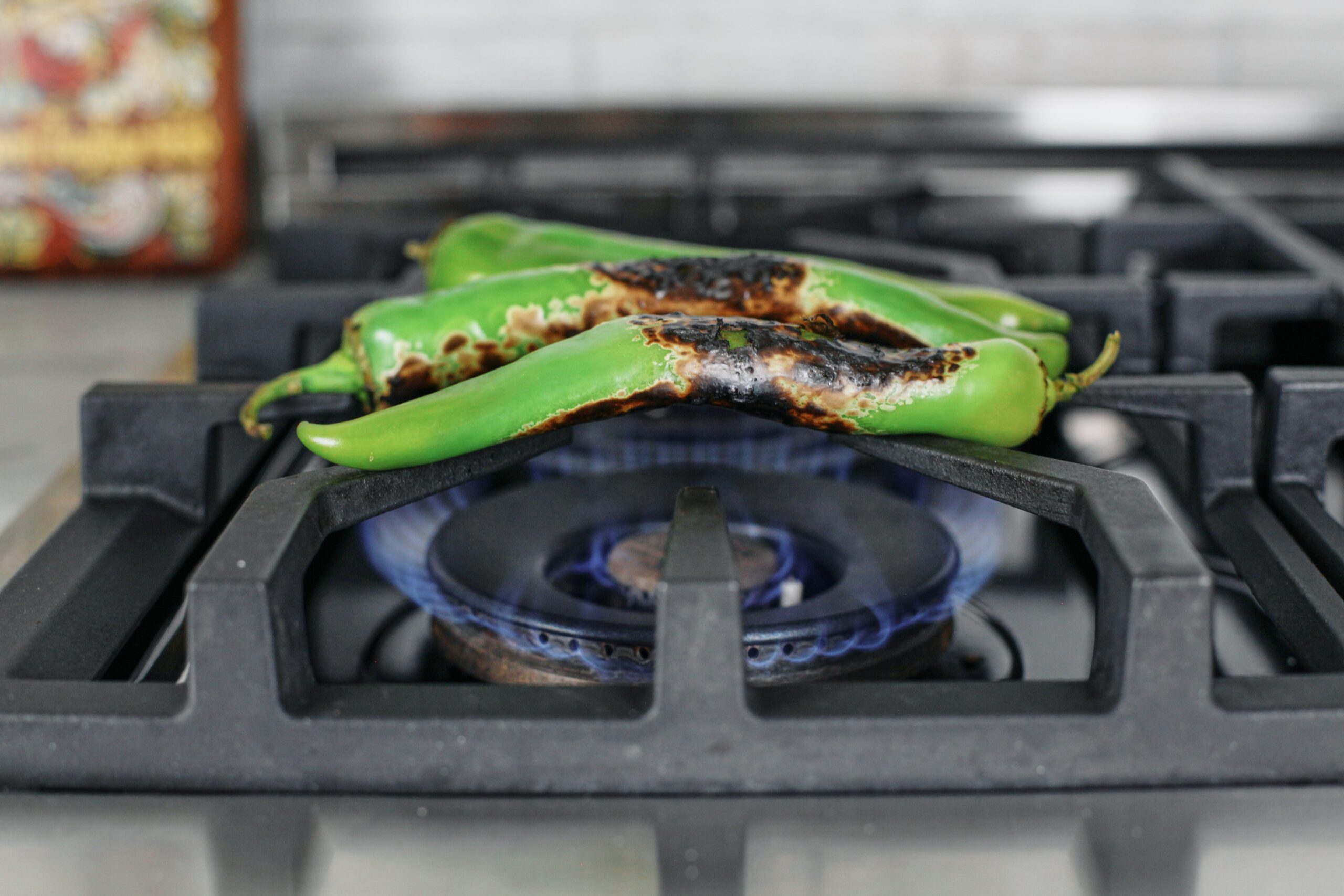 - Char the chiles until blistered, then place them in a covered bowl to steam. Peel off the skins once they’ve cooled slightly, chop, and set aside (or refrigerate until you’re ready to cook).