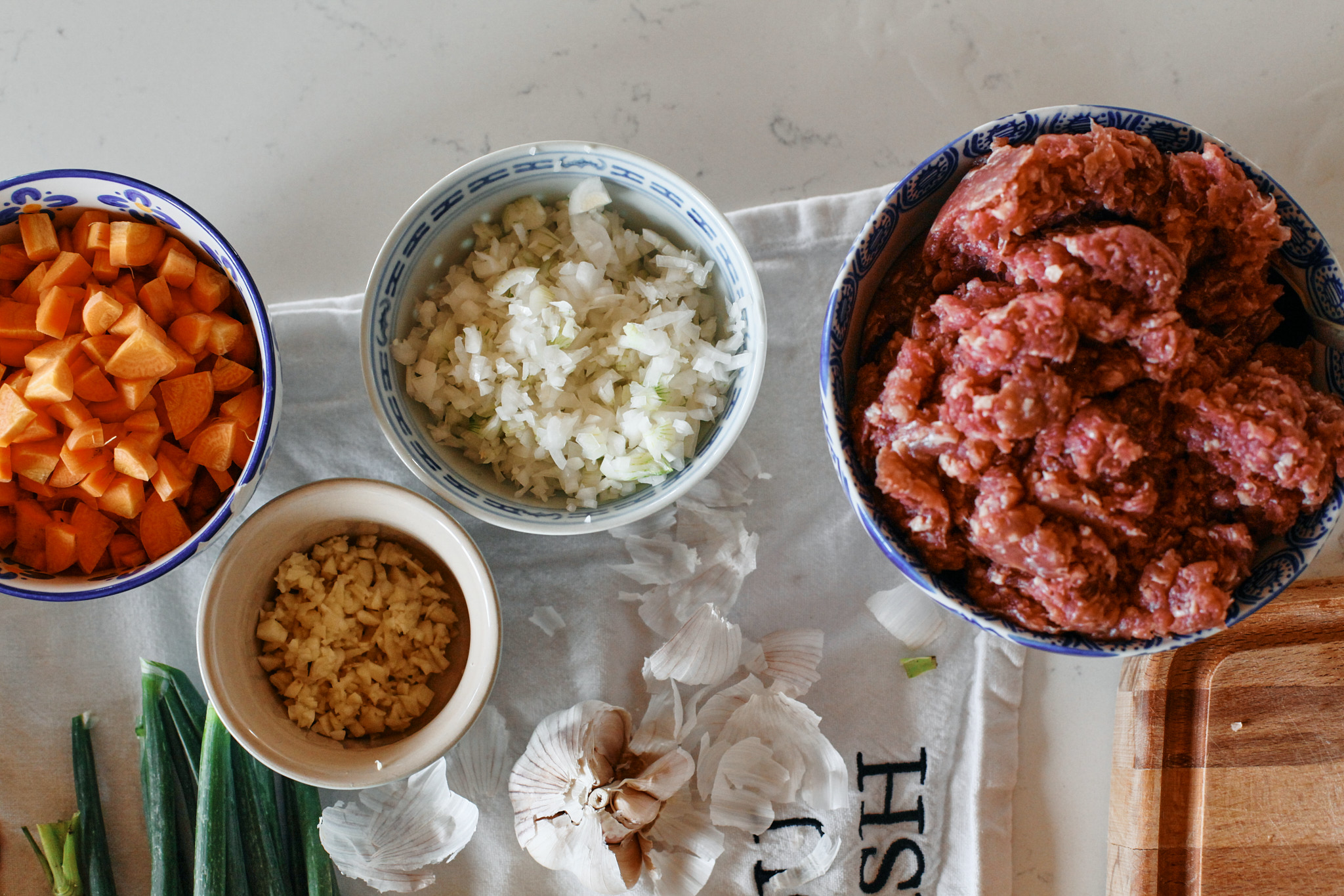 Once I got everything from the garden, I came back inside to prep. Chop up the carrots into small pieces, finely dice the onion, and then wash and peel the potatoes and get them boiling in some water.