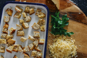 • Cube up your bread, hit with olive oil and salt and toast in the oven at 400 degrees for about 10 min (or until golden).