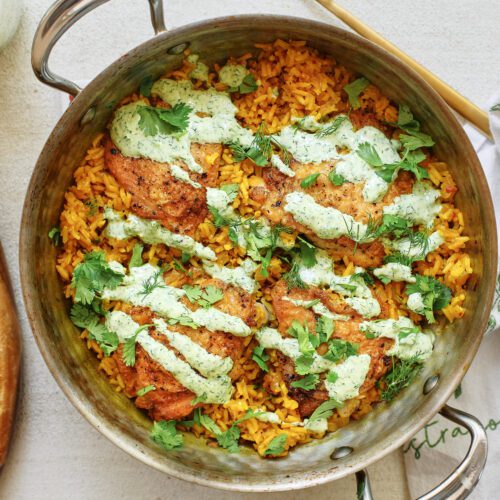 - Cozy but fresh: Crispy chicken thighs and golden rice bring all the comfort, while the herby yogurt sauce adds a bright, refreshing finish.
