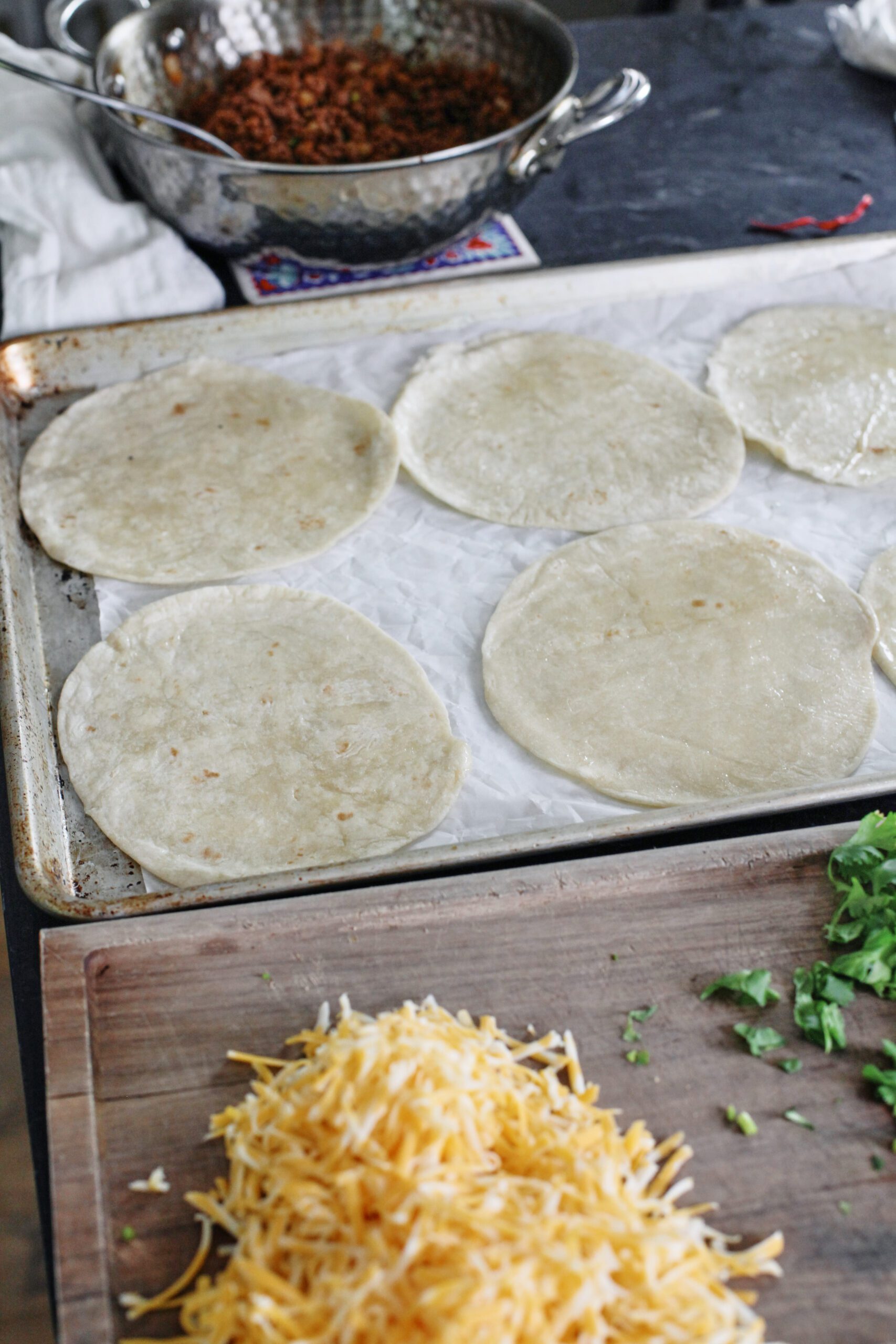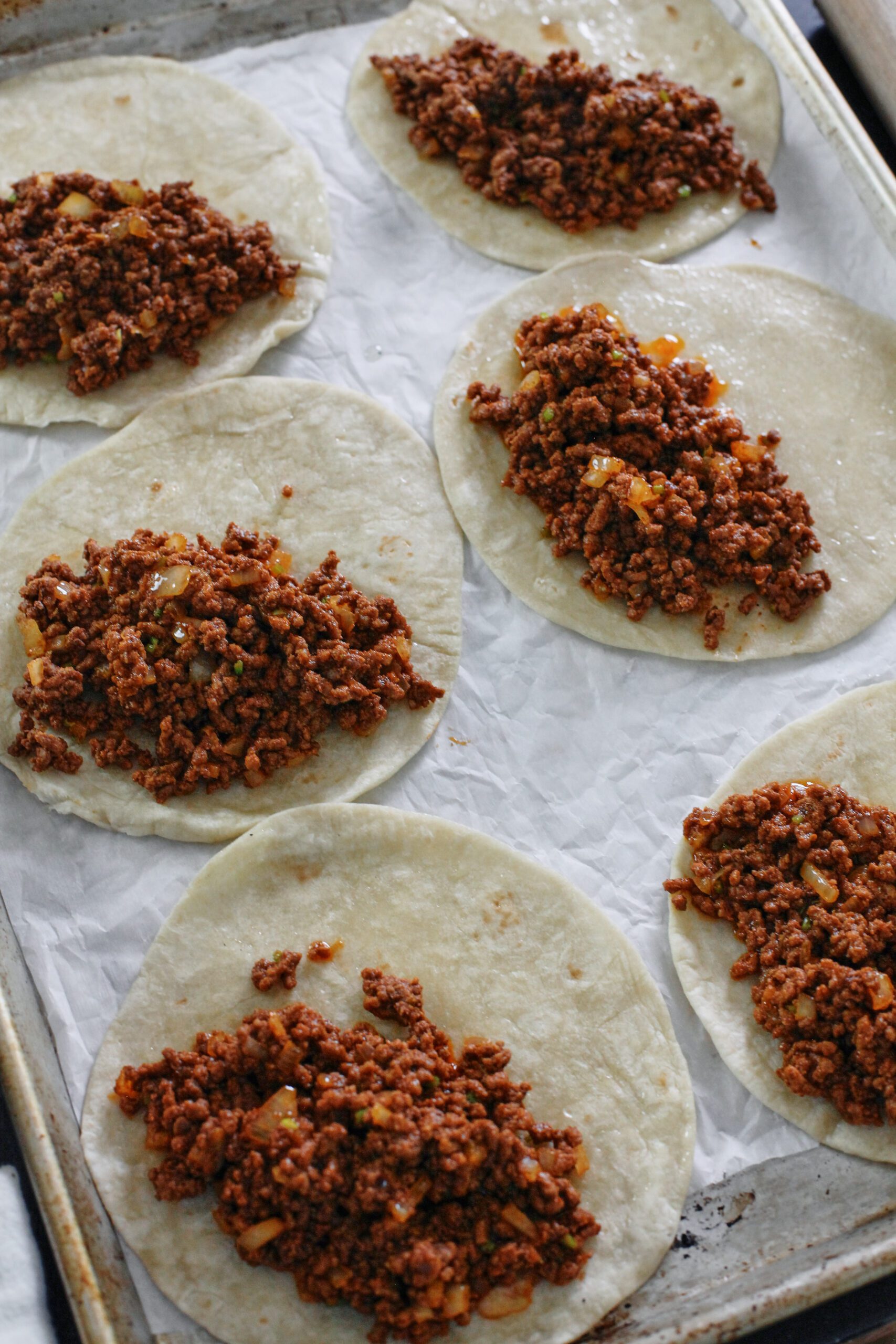 • On a baking sheet lined with parchment paper, place the tortillas and brush on each side with olive oil. Add seasoned ground beef (with a slotted spoon so you don’t transfer over any of the excess oil) to half of the tortilla.