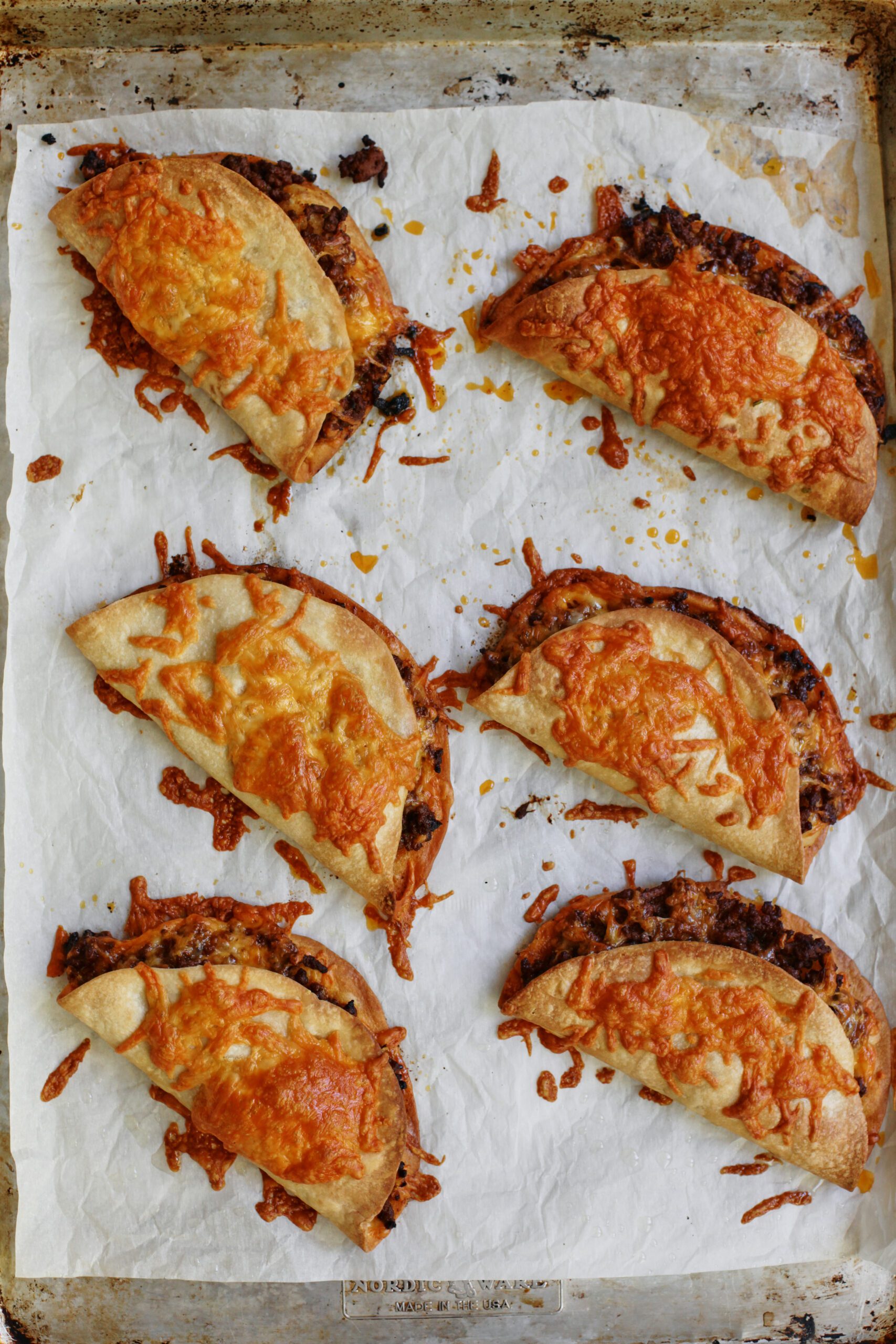 On a baking sheet lined with parchment paper, place the tortillas and brush on each side with olive oil. Add seasoned ground beef (with a slotted spoon so you don’t transfer over any of the excess oil) to half of the tortilla.